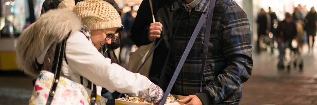 Kultur wächst durch Begegnung: Im Advent 2014 kochten Menschen, die aus ihrer Heimat Syrien, Irak, Iran, Palästina, Afghanistan, Nigeria oder Kamerun flüchten mussten, und verschenkten ihre Schmankerl an Passanten. Foto: Petra Moser_DIE GABE / Die Fabrikanten