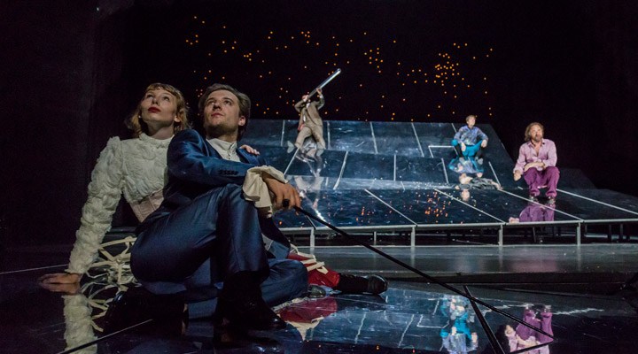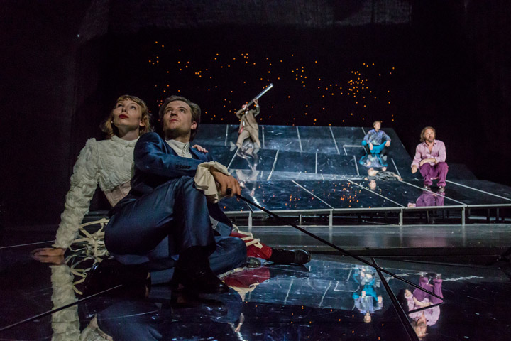 Wenn man bedenkt, wie viel Vorlaufzeit ein Theater in seine Spielplankonzeption setzt, so datiert die Idee, „Leben des Galilei“ von Bertolt Brecht auf die Bühne zu bringen, spätestens mit dem Winterende 2016, also lange vor Trumps Wahlerfolg oder der notwendigen Manifestation in der Öffentlichkeit, was Wissenschaft leistet. Wenn die Realisierung auf der Bühne zum idealen Zeitpunkt den Strom der Zeit kreuzt, dann kommentiert Theater kräftig die Gegenwart. Ja, spielt mehr Brecht! Und zwar so, wie Regisseurin Katrin Plötner „Leben des Galilei“ in einer klugen Verknappung (zwei Stunden) auf die Bühne der Kammerspiele am Landestheater Linz (Oberösterreich) zu stellen versteht: Über spiegelnde Stege, wie ein eigenes Universum, dem im Hintergrund ein Sternenhimmel leuchtet, eine Kristallwelt, in der sich die Sphären wölben, balancieren und stolzieren die Schauspieler. Wie Gedanken in einer Kopfwelt. Wenn einer dieser Gedanken entschwindet, nimmt sich die Figur, von den schrägen Flächen rutschend, aus dem Spiel (Bühnenbild: Anneliese Neudecker).