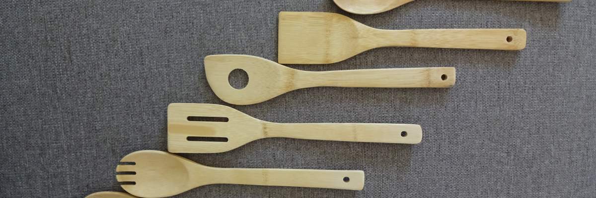 Der Küchenfreund löst sich auch nicht aus der Clique seiner hölzernen Kumpane Kochlöffel, Salatbesteck (zweiteilig), geschlitzter Pfannenwender, gelochter Kochlöffel.